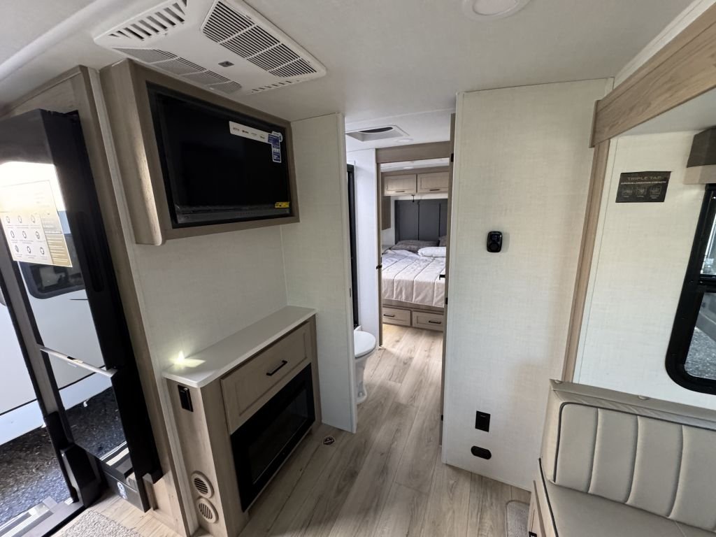 Just beyond the kitchen sits the slide-out U-shaped dinette, giving you room to dine, relax, or convert into extra sleeping space when guests come along. Facing the dinette is an entertainment center, complete with a TV mount and optional fireplace, so you can enjoy cozy evenings inside.