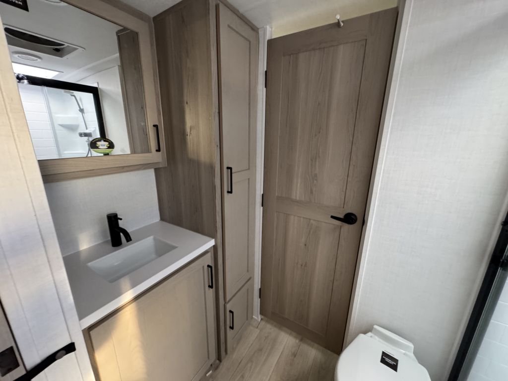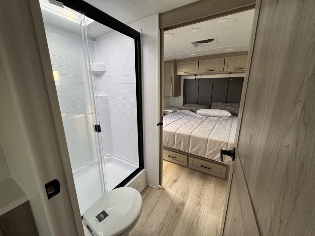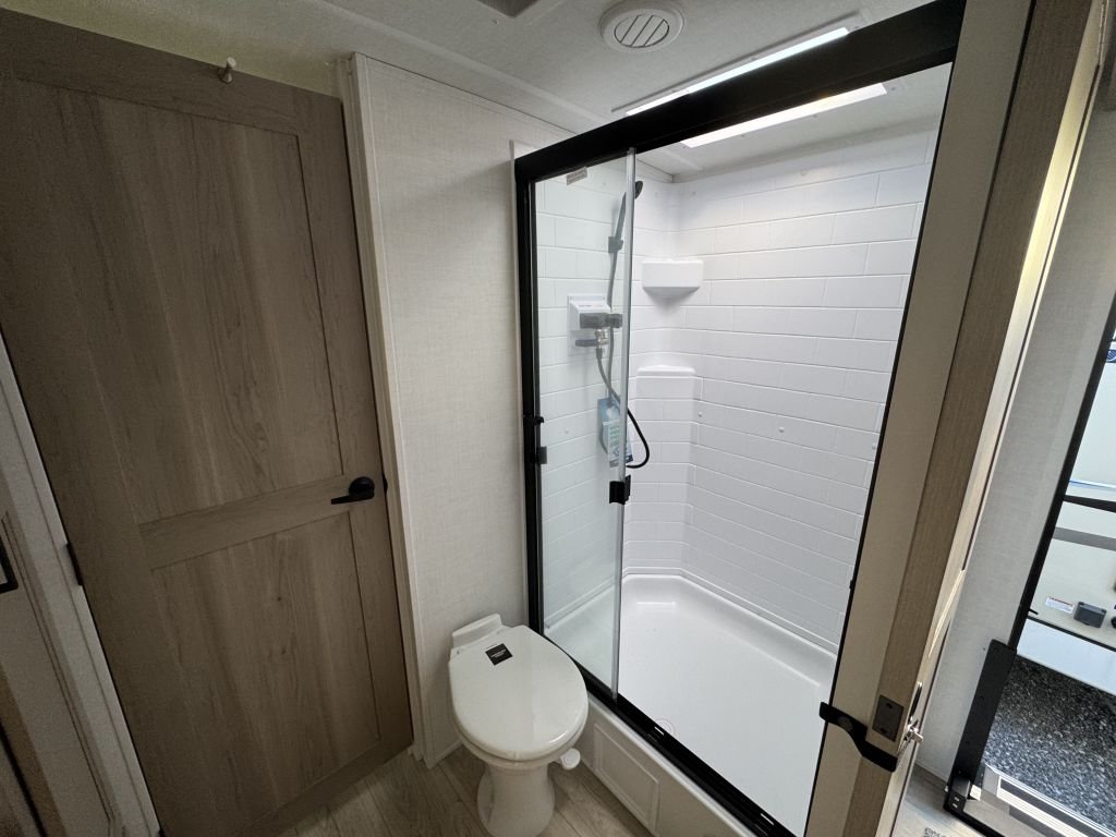 The center bathroom connects the living area and bedroom, offering plenty of space and functionality. Inside, you’ll find: