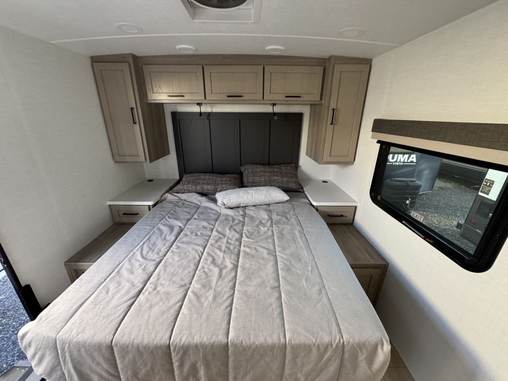 At the back of the trailer, the queen bedroom offers privacy and comfort. It features: